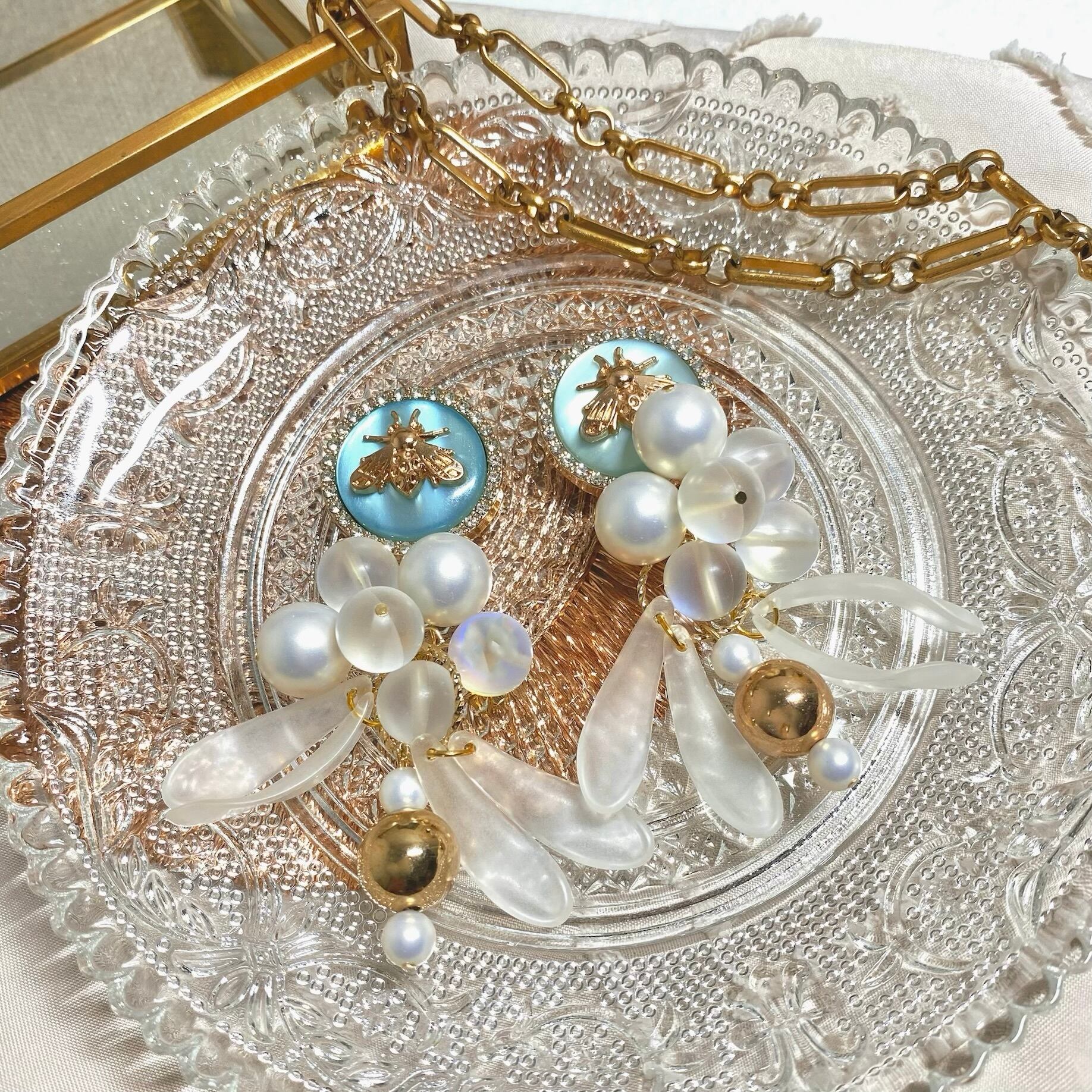 夏のお祭りをテーマにしたアクセサリー。蜂のモチーフと涼やかな水色がポイントです。